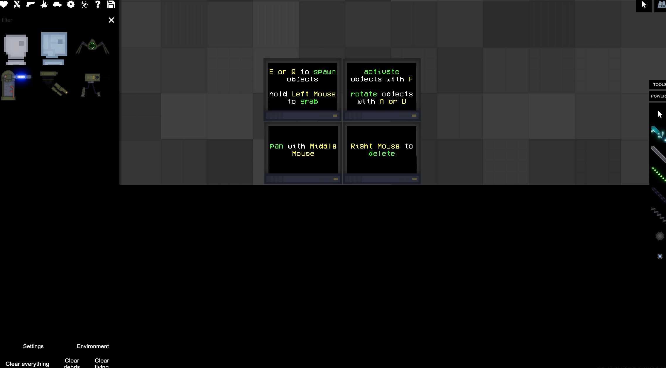 Spawn countless objects including ragdolls, vehicles, weapons, and explosives to experiment.